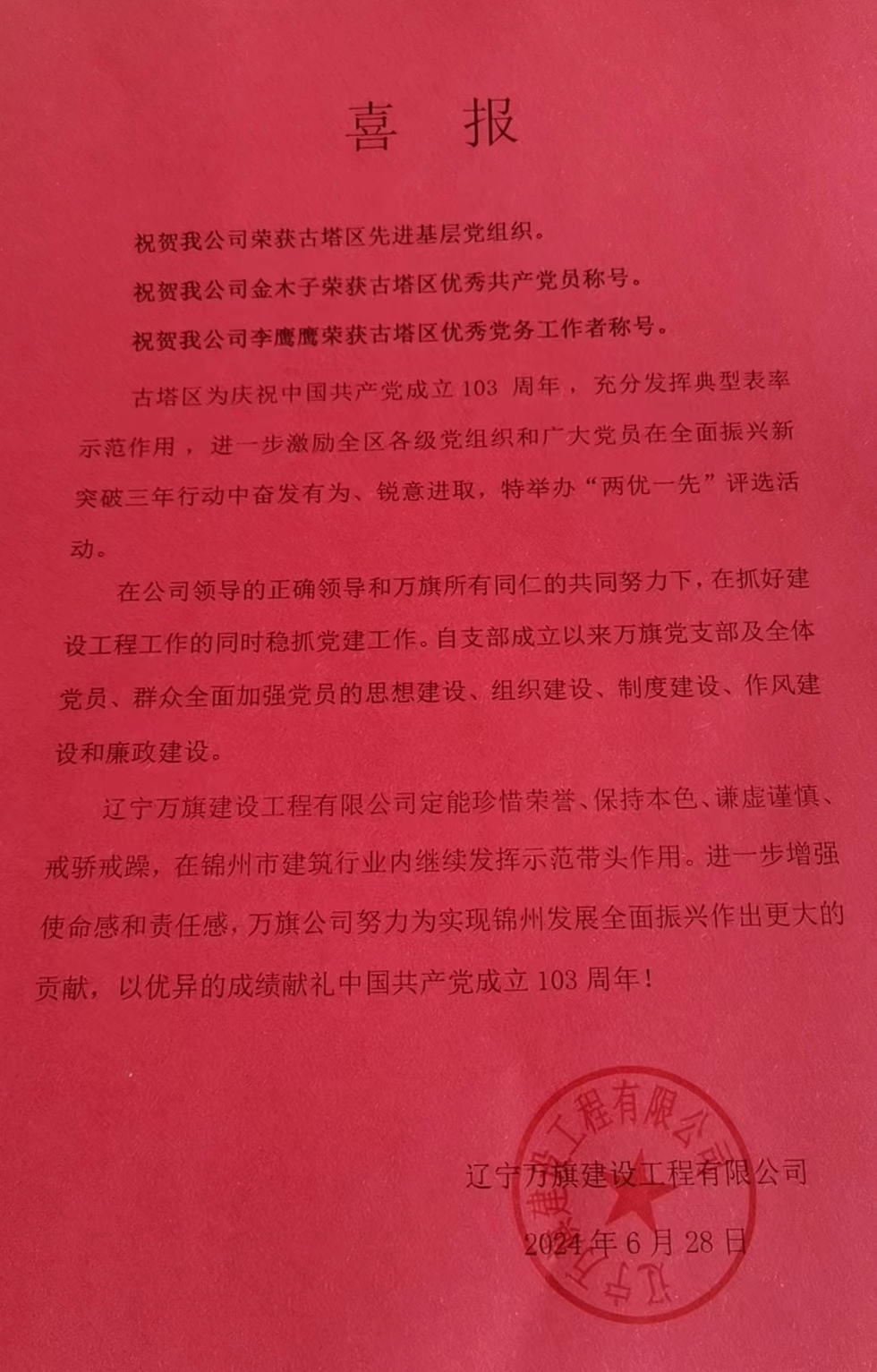 祝賀我公司榮獲古塔區(qū)先進基層黨組織
