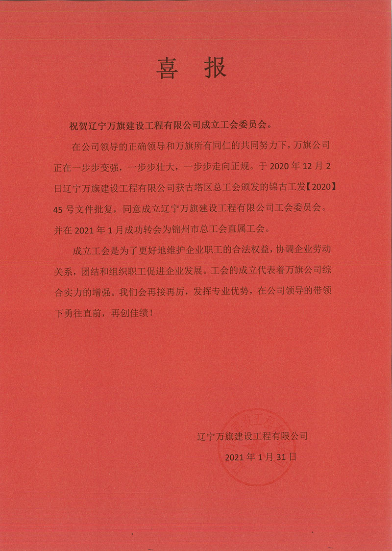 喜報(bào)祝賀遼寧萬旗建設(shè)工程有限公司成立工會委